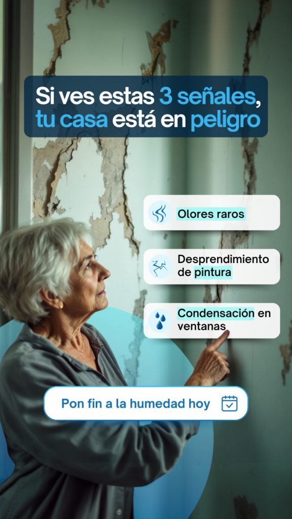 Los síntomas más habituales son manchas en la parte baja de las paredes, pintura descascarada y olor a humedad. Nuestro equipo puede realizar un diagnóstico gratuito en tu hogar de Burgos.